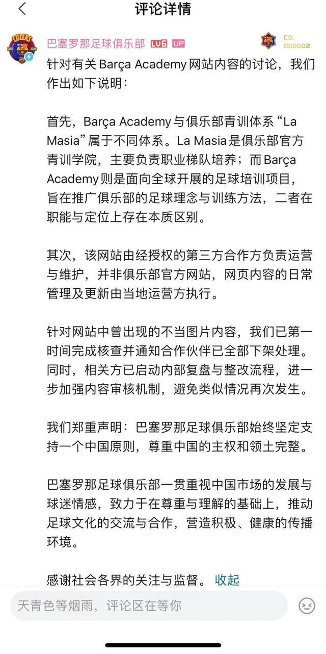 4月21日晚上,针对Barça Academy网站出现不当图片内容,巴塞罗那足球俱乐部(昵称“巴萨”)在其B站官方账号动态评论区中发文回应。